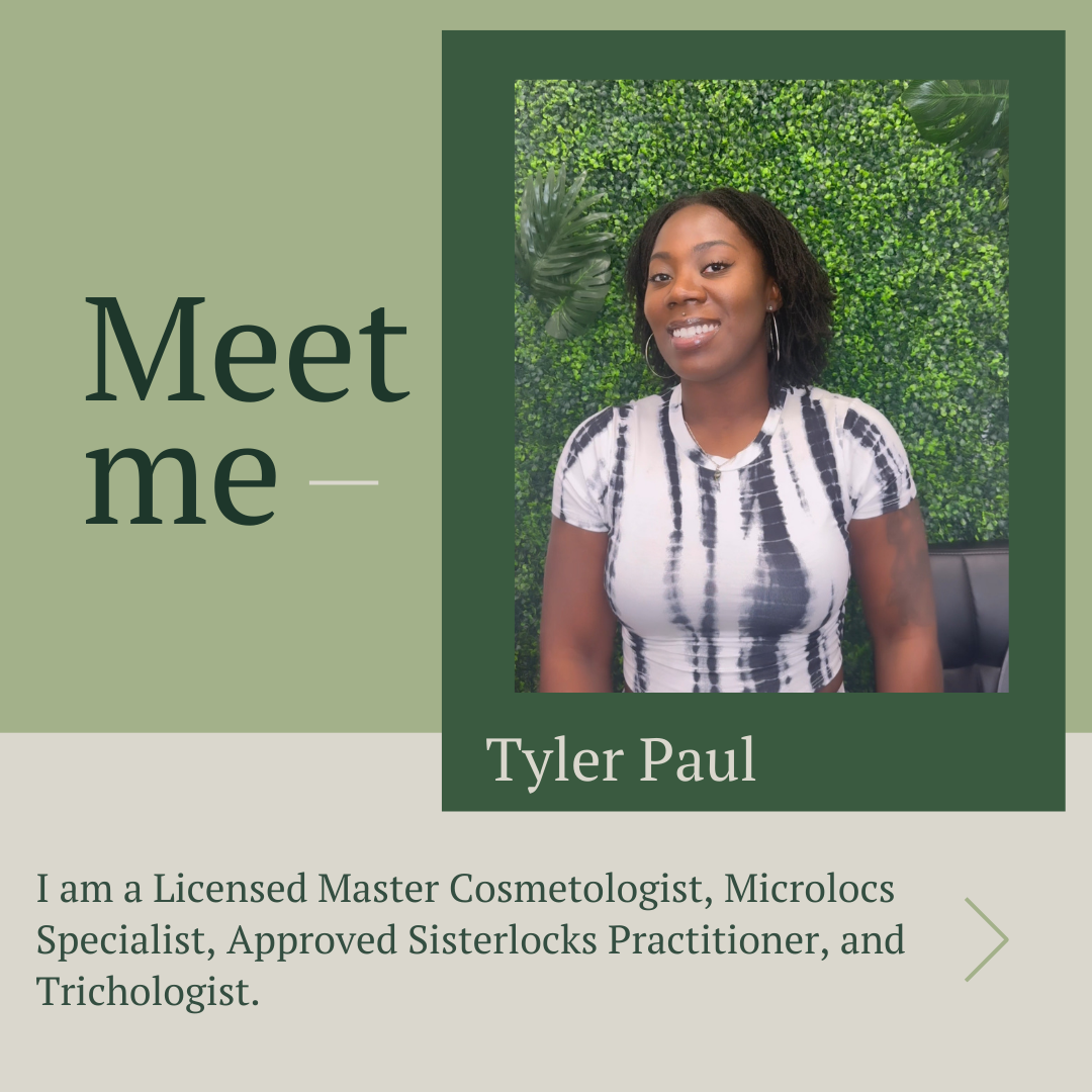 Hello! My name is Tyler, I am a Licensed Master Cosmetologist, Sisterlocks Trainee, Trichologist and Hair Loss Practitioner. I am the proud owner of Heal Thy Hair Salon Suite. I specialize in microlocs, natural and textured hair styling, customized scalp care and herbal hair care treatments.