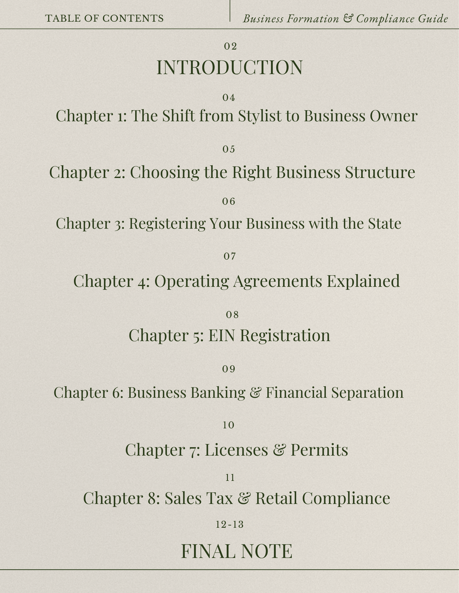 Cosmetology school prepares you to perform services—not to build a legally compliant business. This ebook helps licensed cosmetologists understand the right order of steps to structure, protect, and legitimize their business with confidence.